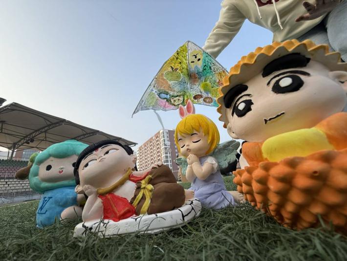 活动现场,工作人员备齐空白风筝、石膏坯体及各色创作材料。同学们或独立构思或结伴交流,在风筝上勾勒传统纹样、融入国潮元素,为石膏娃娃添上灵动色彩,创作中相互借鉴、共享乐趣,草坪上满是欢声笑语。